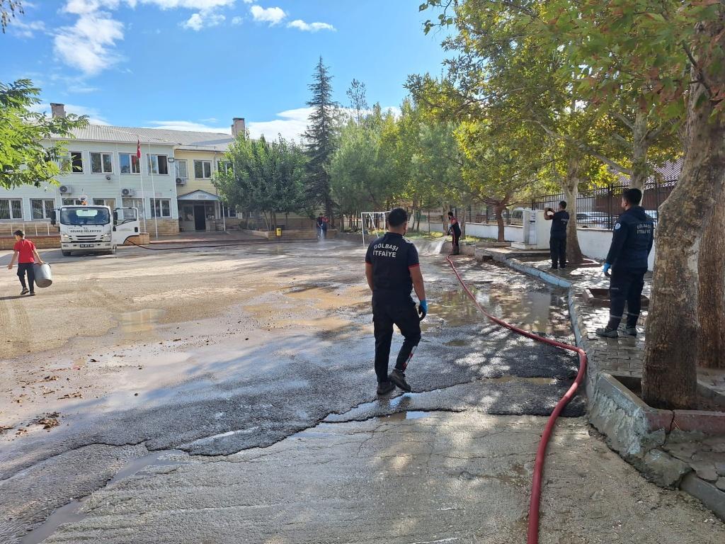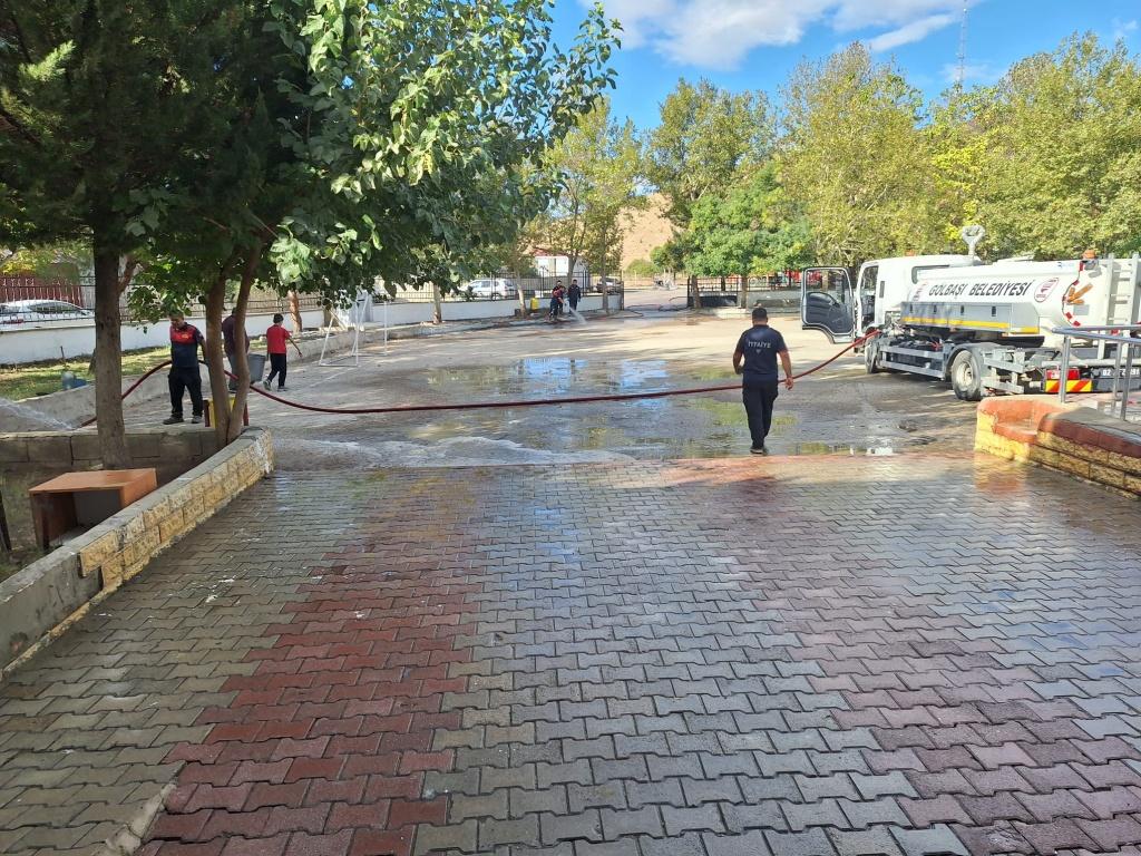 Gölbaşı Belediyesi itfaiye ekipleri okulumuzun bahçesini yıkayarak ögrencilerin temiz bir bahçede oynamalarına olanak sağladı.